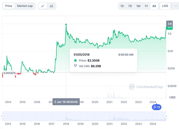2012年XRP首次发行时价格仅为几美分,随着Ripple协议的推出以及与一些金融机构的合作,XRP价格在2013至2014年间逐步上涨,最高达到约0.10美元。2017年末,在整个加密市场的牛市推动下,XRP迎来了第一次大幅上涨,特别是在2017年12月,XRP的价格突破3美元创下历史新高,一跃成为当时市值第三大的加密资产。