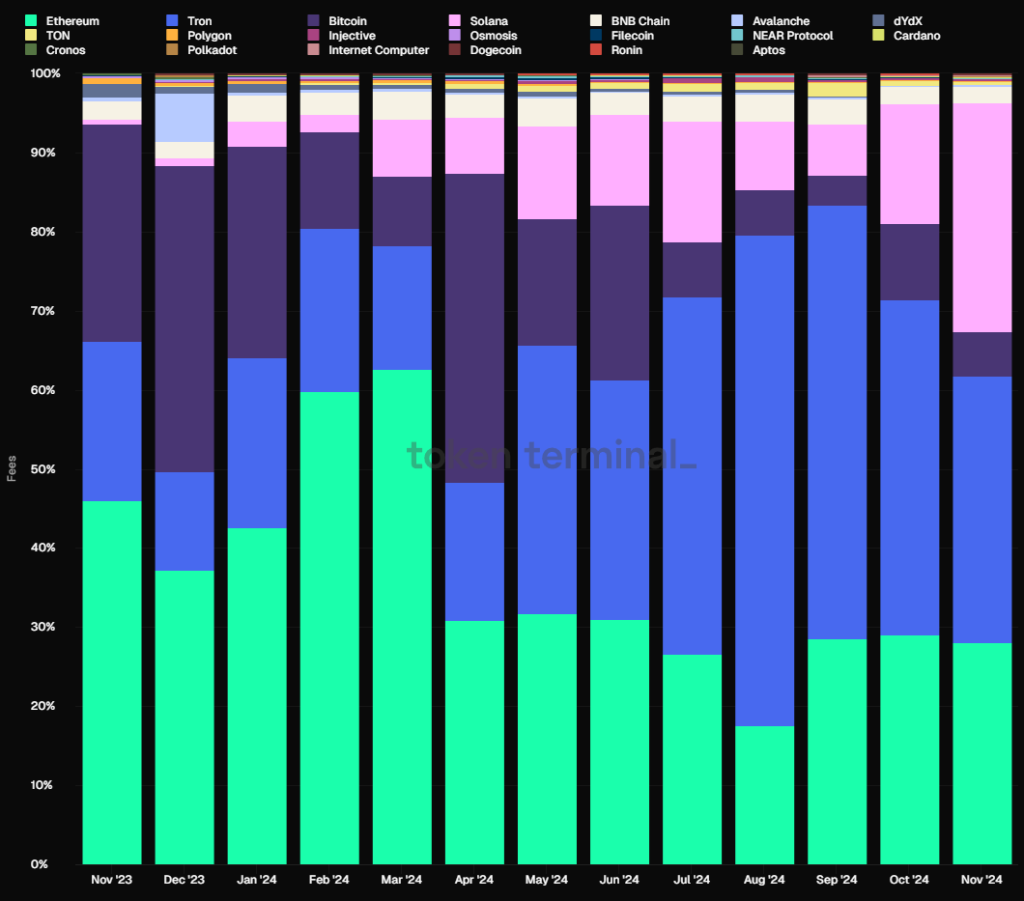 费用:Solana 的 Fee 收入份额从 0.62% 增长至 28.92% ,同比增长 4564% 。