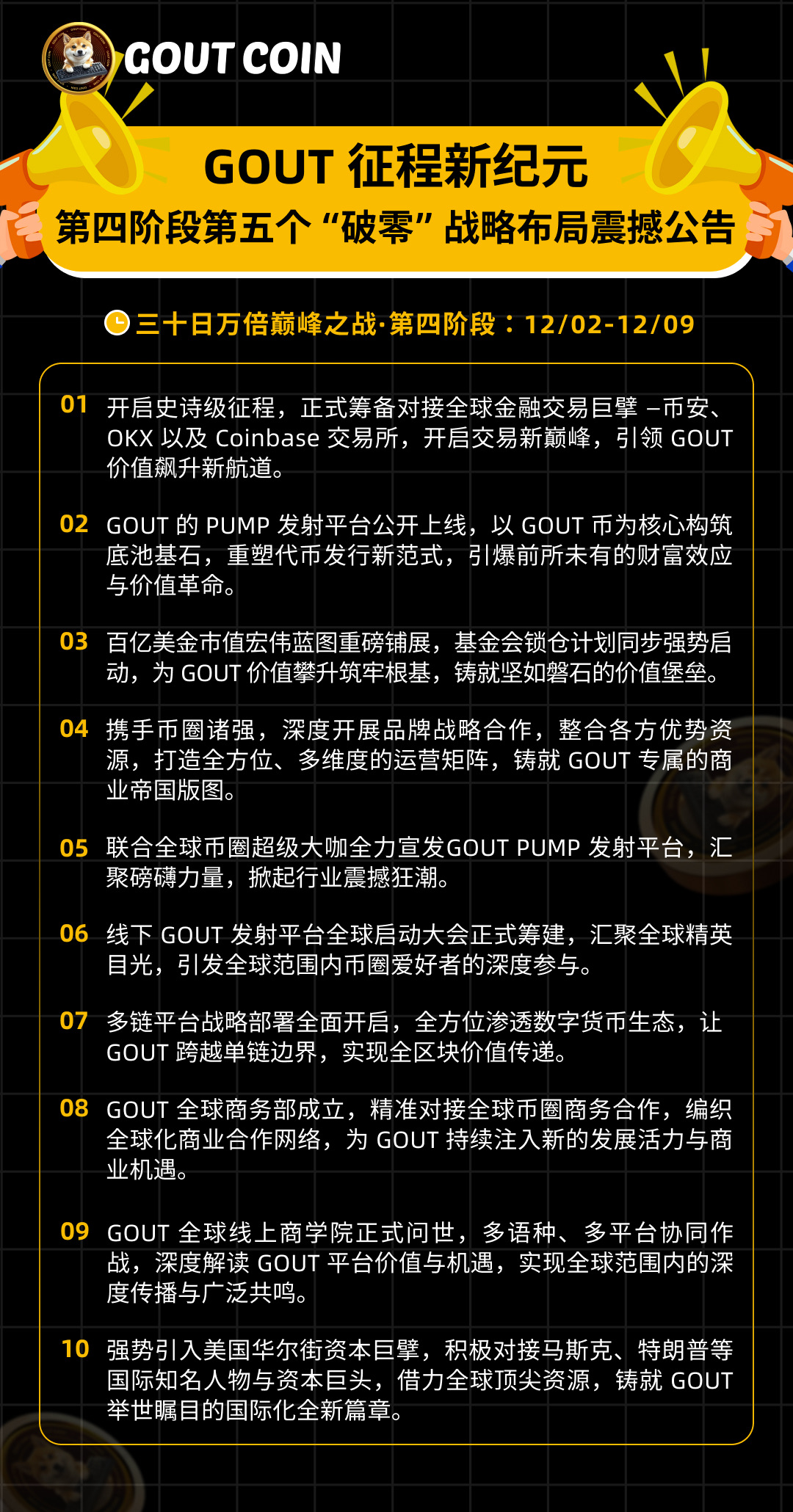在全球化视野的指引下,GOUT Coin将继续拓展生态版图、加强技术创新,为区块链市场注入更多活力。我们期待GOUT Coin在未来突破更多里程碑,成为行业中不可忽视的标杆项目!