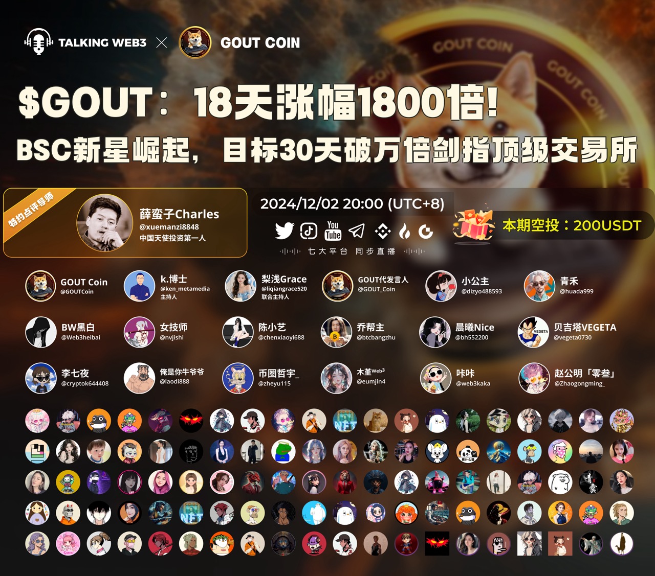 2024年12月2日晚,由GOUT Coin与Talking Web3联合举办的特别直播活动在X(推特)、币安、火币、YouTube、TikTok、Telegram、Tencent Conference(腾讯会议)等七大平台同步播出,超百位知名华语KOL共同参与,取得了超过25万人次观看的瞩目成绩。本次活动以“$GOUT:18天涨幅1800倍——BSC新星崛起,目标30天破万倍剑指顶级交易所”为主题,成为近期区块链行业最引人瞩目的热点,进一步确立了GOUT Coin在Meme赛道及区块链生态中的核心地位。知名投资人薛蛮子更是在直播中表示:“我感受到了GOUT社区极大的热情,同时也不乏理性,GOUT在我心里的分数很高。”