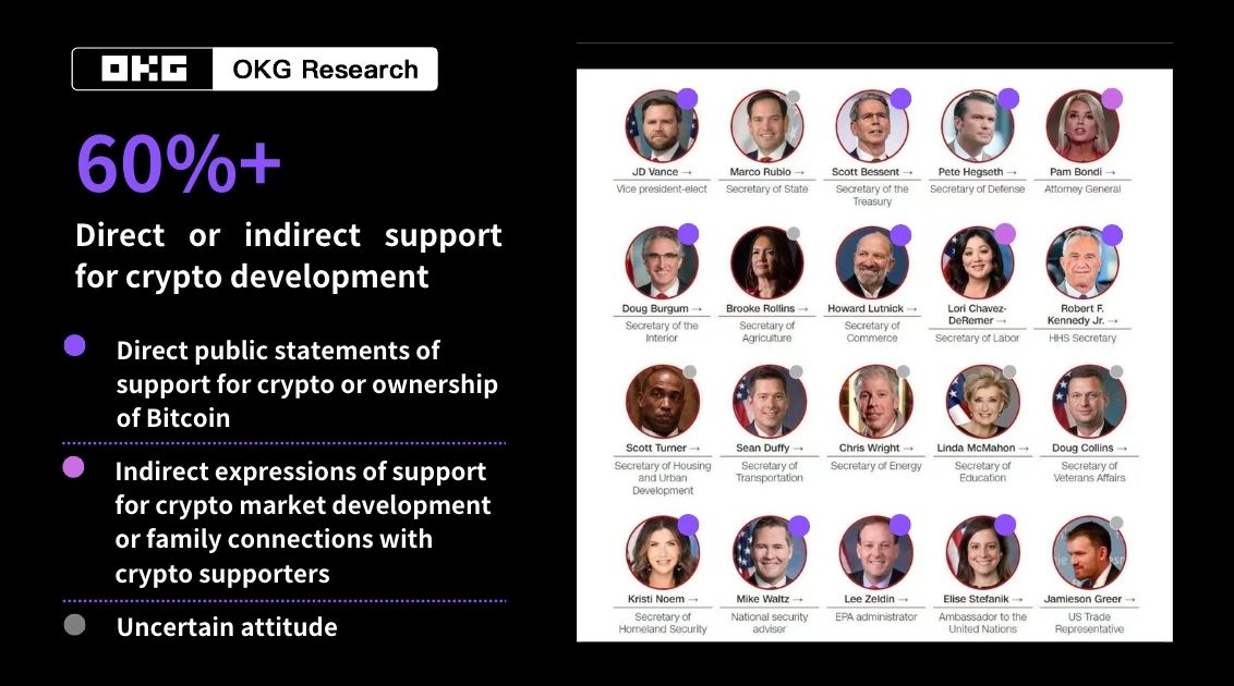 此外,特朗普的其他团队成员也为加密金融的监管专项提供了强有力的支持:超过60%的提名内阁成员公开表示拥有比特币或支持加密金融的发展,或间接支持加密资产的成长。