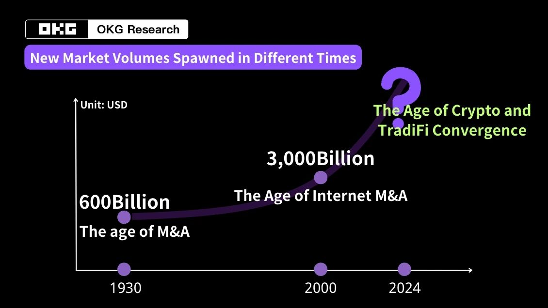 除了未来以AI为主要推动力的数字社会绕不开加密资产外, 渣打银行也曾表示,几乎现实世界的任何真实资产都可以代币化,并预计到2034年,全球对代币化资产的需求将达到30万亿美元。无论是数字社会的未来发展需要加密资产,还是现实社会的资产流通需要代币化,加密资产与传统金融资产的融合,这一市场的潜力将远超1930年代的“大并购时代”和2000年的“互联网并购时代”,前者催生了6000亿美元的产业整合,后者更推动市场规模达到3万亿美元。