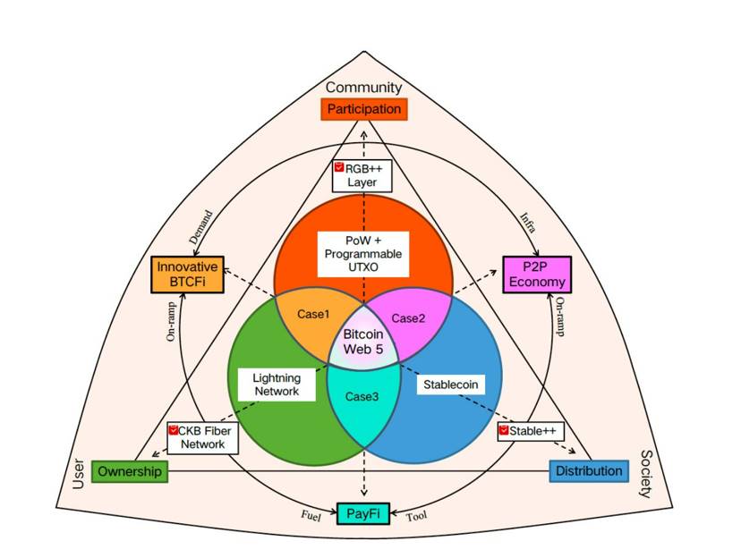 首先将原本由用户负责的客户端运行及验证工作交给 CKB,这种比特币作为主链、CKB 充当影子链、二者之间通过 UTXO 与 Cell 双向绑定的方案,不仅实现对比特币强大安全基础的继承,而且解决了 RGB 的全局可验证性问题,更重要的是,CKB 使用 CKB-VM 虚拟机带来了强大的智能合约能力,使得 RGB 协议成为孵化比特币原生 Meme 的摇篮。