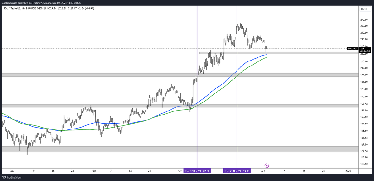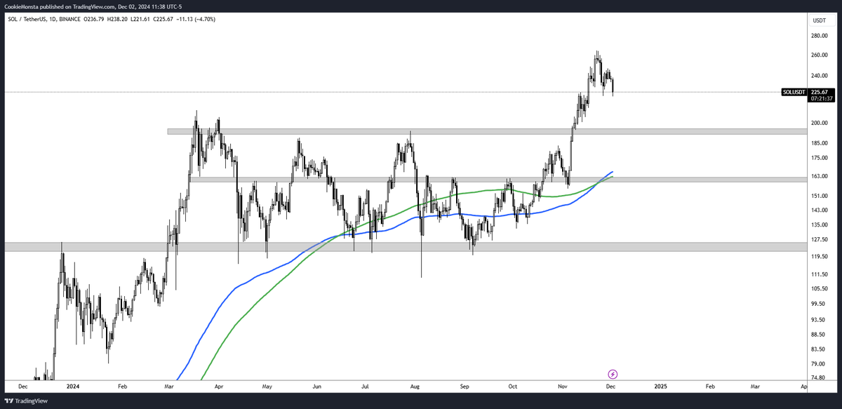 随后,两者都在局部见顶后进入了一段整固期。在此期间,SOL 再次领跑市场,上涨了 30%,并创下了新的历史高点 (ATH)。