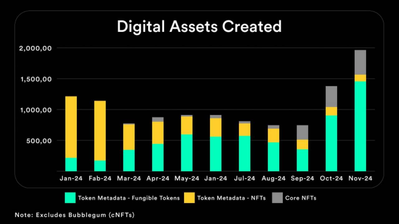 Metaplex 在可替代 Token 创建方面表现出色,铸造了 140 万个新 Token——与 2024 年 10 月的前一个历史高点相比,环比增长 56%,创下新的月度记录。这代表了所有创建的 Token 元数据资产的 94%,主要由 Pump.fun 等平台上的 Memecoin 活动推动。