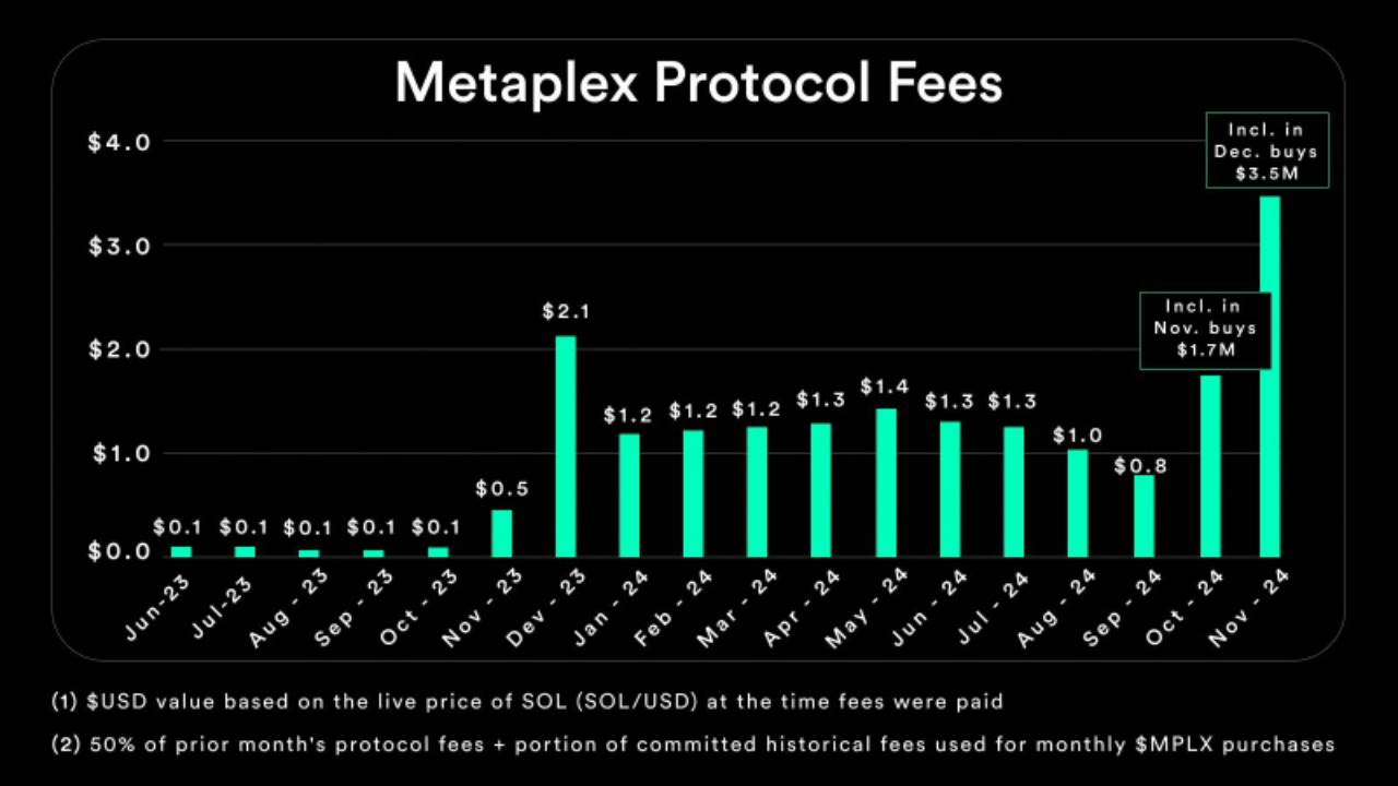 在此基础上,Metaplex 在 11 月的协议收入达到创纪录的 350 万美元,为 12 月的 $MPLX 购买提供了更充裕的资金。
