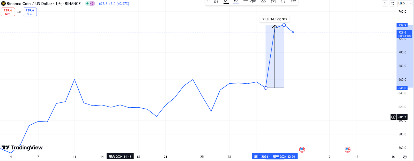 本轮周期内,BNB 似乎一直比较“低调”,没有出现特别大的涨幅。而近期,BNB 在加密货币市场上表现亮眼,其价格实现了约 14% 的显着涨幅,引起了投资者的广泛关注。