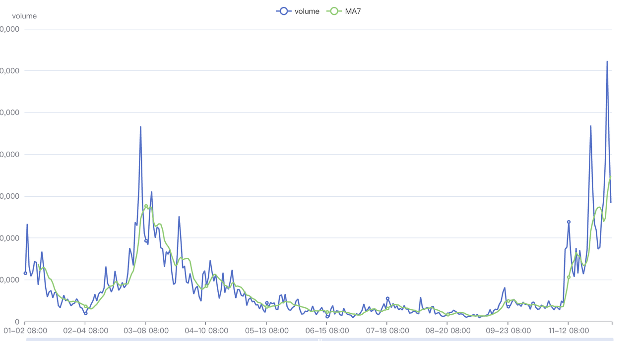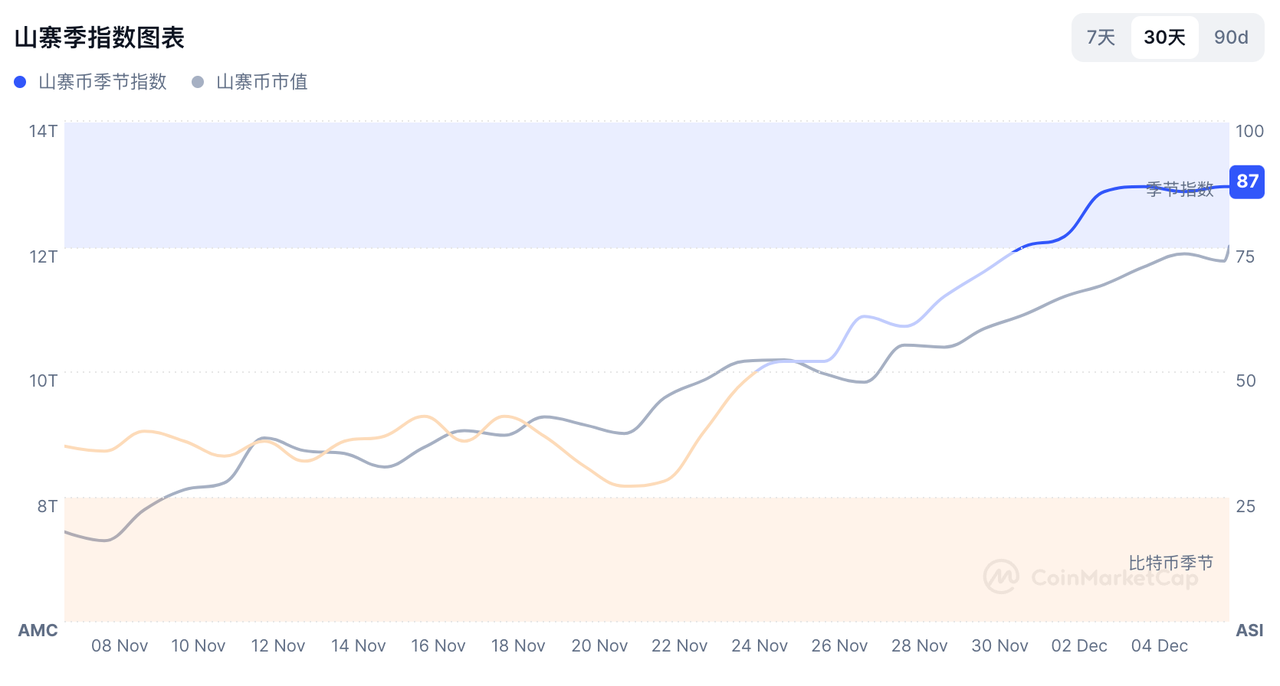 从山寨季指标来看,目前数值已升至 88。该指标旨在衡量山寨币相较于比特币的盈利能力。具体代表的是前 50 山寨币中有多少代币表现的比 BTC 在上一季(90 天)的表现更好,其数值越大,则说明当前越是山寨季。这一数值对比 11 月初的 30 左右,已达到今年来高点。