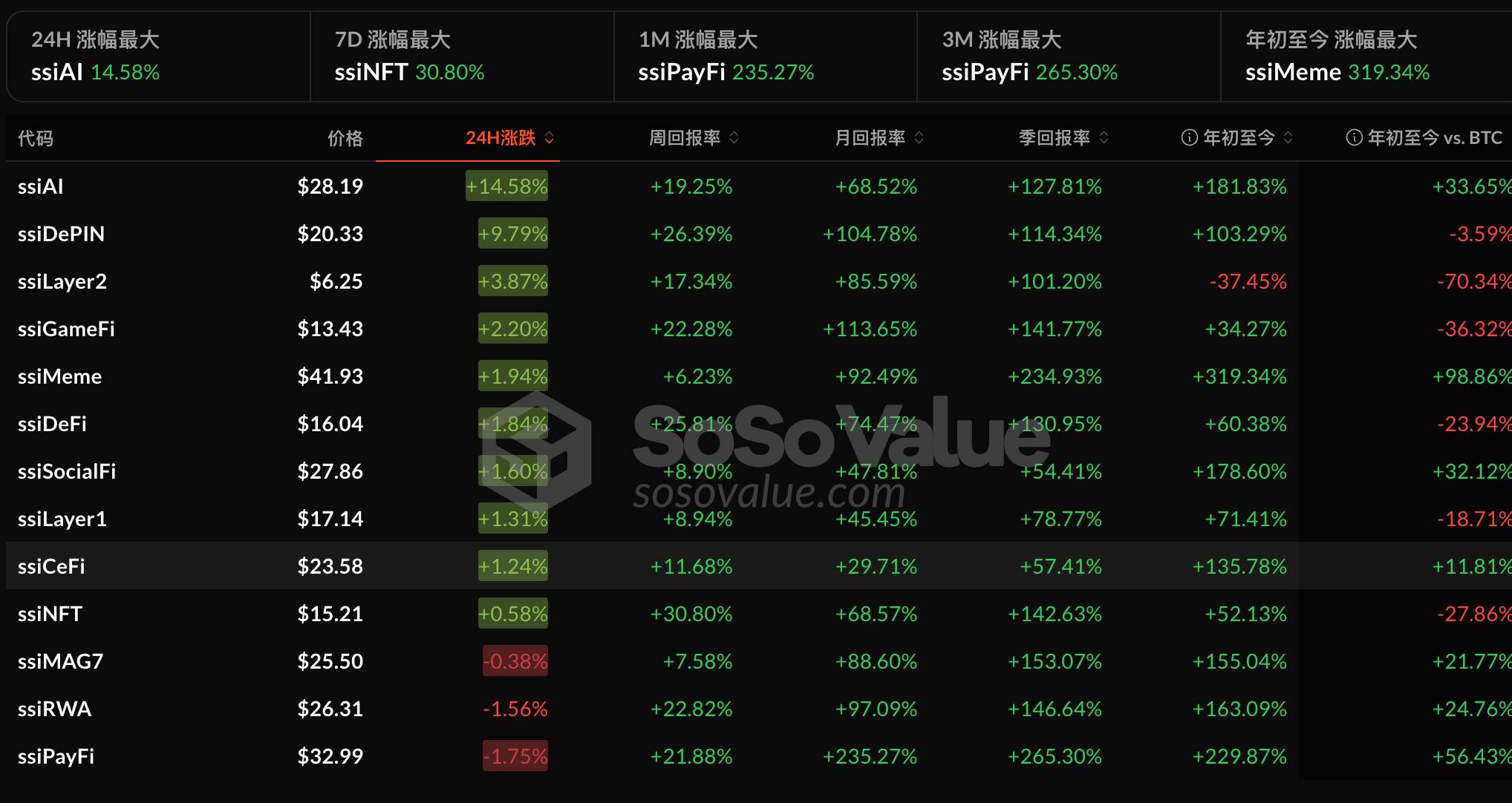 或受 OpenAI 发布会利好影响,AI 板块出现全面上涨。根据 SoSovalue 数据显示,AI 板块在昨日出现普遍上涨,据 Bitget 行情,JASMY 24 小时涨幅达 45.26%;MASA 24 小时涨幅达 28.96%;WLD 24 小时涨幅达 25.86%;RENDER 、ANKR 24 小时涨幅也达 20%。
