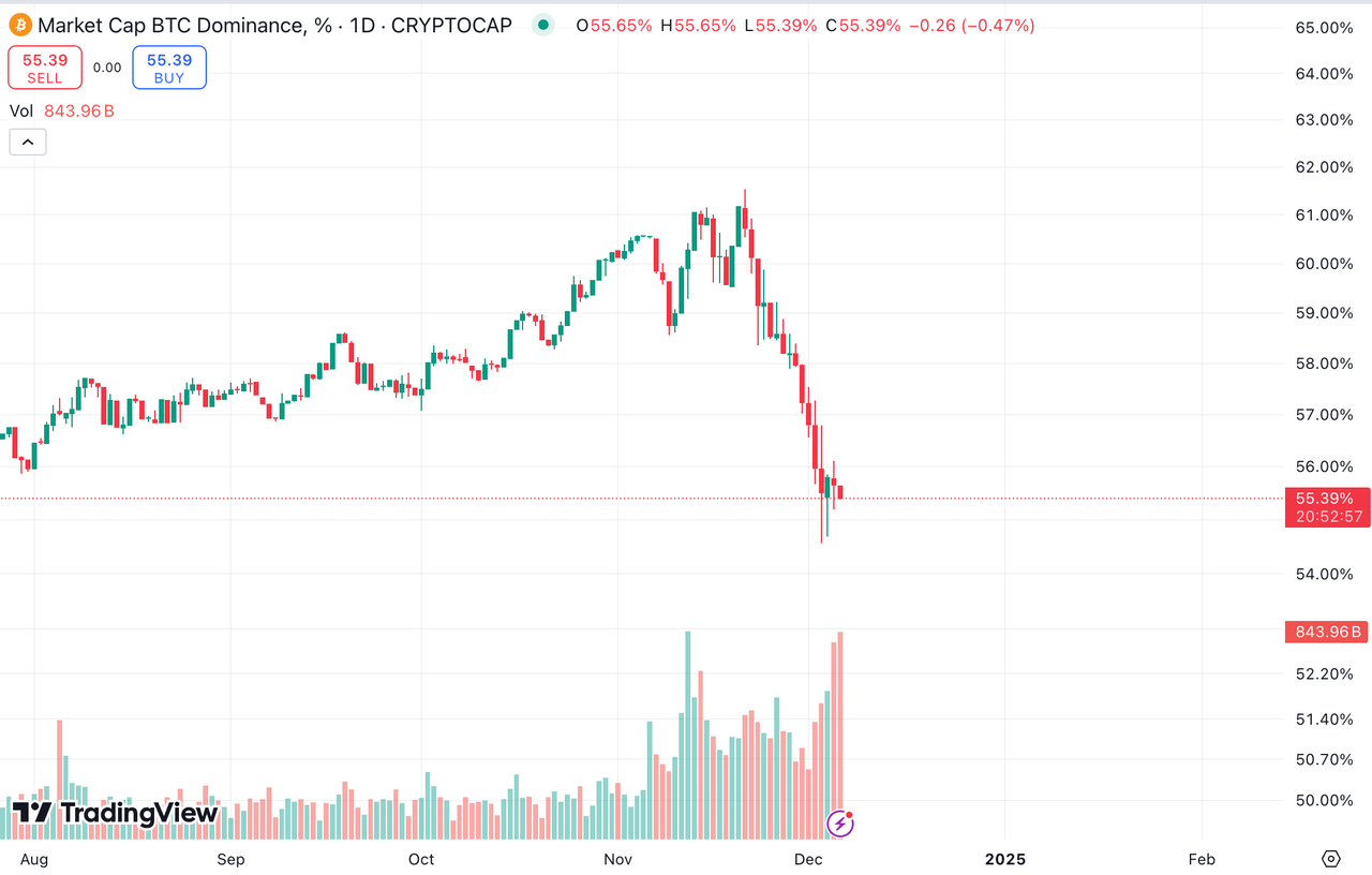从 BTC 市占率来看,已于 11 月 21 日达到阶段性高点 61%,据历史来看,当比特币市值达到了 65–70% 的这个区间时,通常会迎来山寨季。而今年在达到 61% 后已经开启山寨全面普涨。之后 BTC.D 持续下降,目前已降至 55%,
