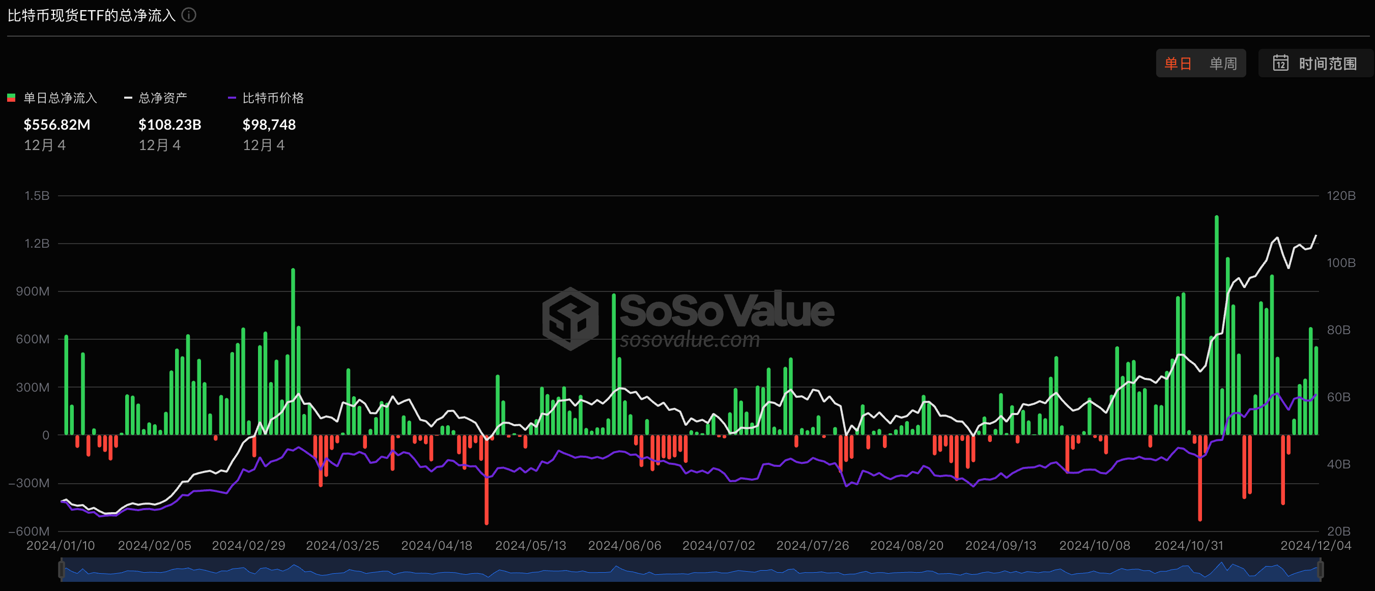 比特币现货 ETF 数据,可以了解场外资金动向。净流入较大时,买盘增加,比特币价格上涨可能性较大。根据 SoSovalue 数据显示,比特币现货 ETF 仍处于不断净流入状态,但流入金额在逐步降低。而比特币资金费率在接连上涨后,于 12 月 5 日达到高点,随着昨日多头杠杆的清算,目前已出现回落,这代表市场看多势头有所降低。