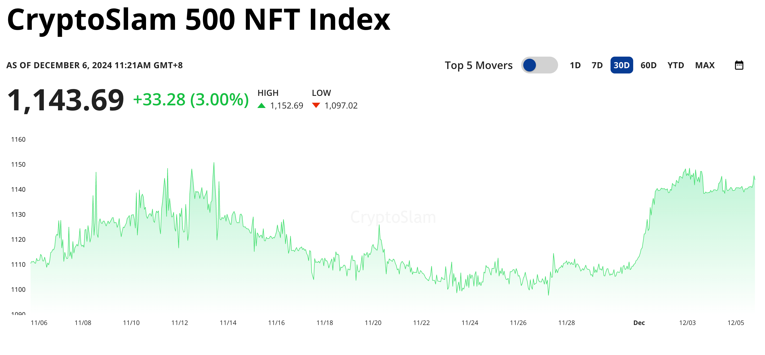 NFT 板块近 7 日也逐步回暖,成 7 日涨幅最大板块达 30%。据 CryptoSlam 数据显示,衡量 NFT 市场表现的 CryptoSlam 500 NFT 综合指数,近三个月内也已回升约 33%。