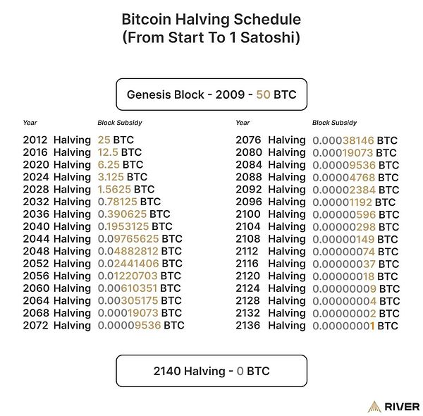 上图是BTC产量减半的时间表。每次减产后会挖掘21万个区块,大约4年的时间。简单计算可知,从2104年减产之后,直到2140年完全停止产出,总共可以产出BTC的数量为: