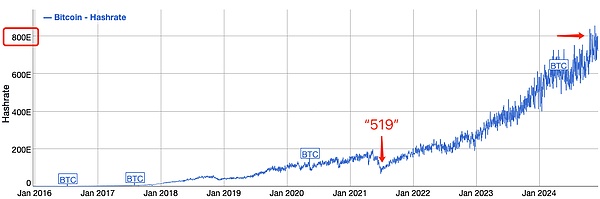 现在,全球BTC网络已经拥有高达约800EHash/s的算力。800EHash/s,就是一秒钟能够计算800 x 10^18个哈希数,即800,000,000,000,000,000,000个哈希数。
