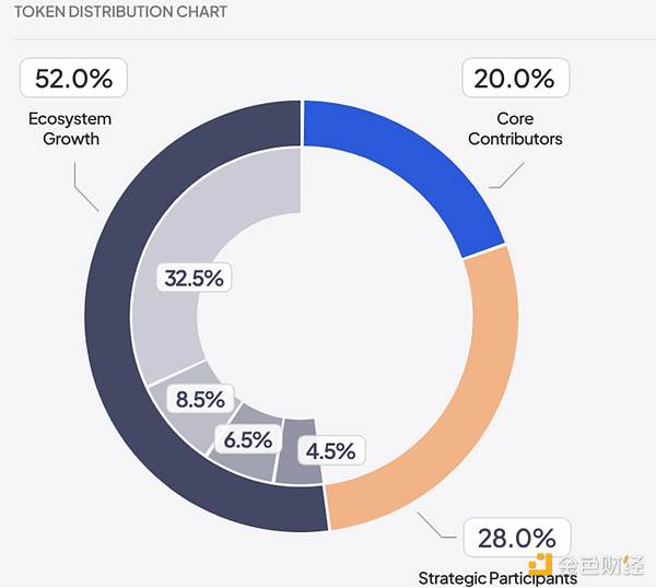 52% 的代币用于生态系统增长,20% 的代币给核心贡献者(第一年无解锁,之后两年线性解锁),28% 给战略合作伙伴(顶级风投和做市商,第一年无解锁,之后两年线性解锁)。
