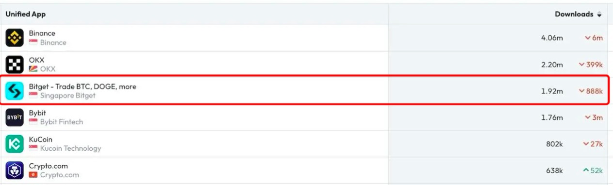 除了留住存量用户,Bitget 也是众多增量用户入场的首选之一。根据 Data.ai 数据,Bitget 应用在 10 月下载量达 192 万次,位居全球中心化交易所应用下载量第三,仅次于 Binance 和 OKX。