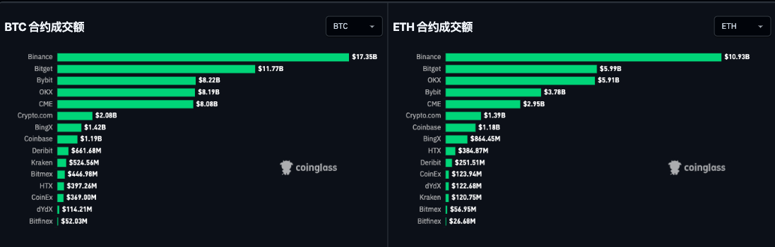 Coinglass 数据显示,比特币 24 小时合约交易额前三名的中心化交易平台中 ,Bitget以 117.7 亿美元位列第二 ;以太坊合约交易额方面,前三名的中心化交易平台分别为Binance、Bitget,OKX,Bitget 24 小时合约交易额达 59.9 亿美元,仅次于币安。