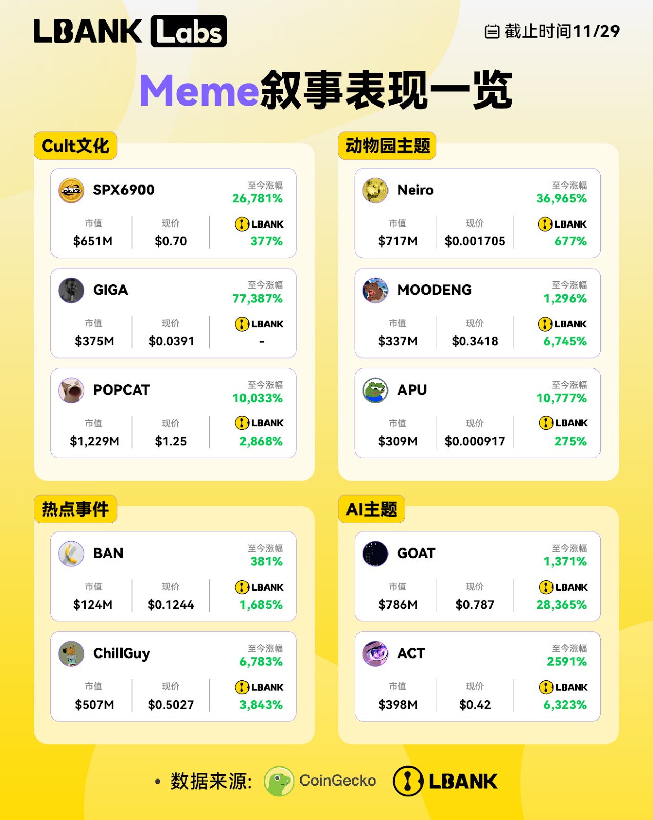 Q4中,Neiro引领狗狗主题Meme币的狂潮,经历了戏剧性起伏。Solana链的Neiro因Vitalik抛售MEME代币而暴涨50倍,Ethereum上的大写NEIRO借助交易所推动一度市值回升至1.8亿美元,但因“老鼠仓”事件遭遇信任危机。此时,社区版的小写$Neiro上线Binance,暴涨30倍,成为Meme新兴力量。10月下旬,$GOAT(Goatseus Maximus)以AI为主题的Meme崛起,4天涨幅70倍,登上Binance合约。10月底,$Ban以苏富比拍卖的香蕉艺术品为背景迅速突破2,000万美元市值,成为行为艺术热点。