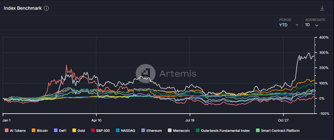 根据Artemis Terminal数据,年初至11月29日,Memecoin以279.8%的Benchmark指数表现,远超Bitcoin的118.9%和黄金的27.4%。其中,在2024上半年中,AI Token领跑,但从三月开始,Memecoin赶超且逆势走强,Benchmark指数稳居top1,数据维持在40%以上;在2024下半年,伴随行情复苏,Memecoin、Bitcoin和黄金走势呈现正相关,其中Memecoin的Benchmark指数表现明显优于Bitcoin、黄金和Outerlands基本面指数。
