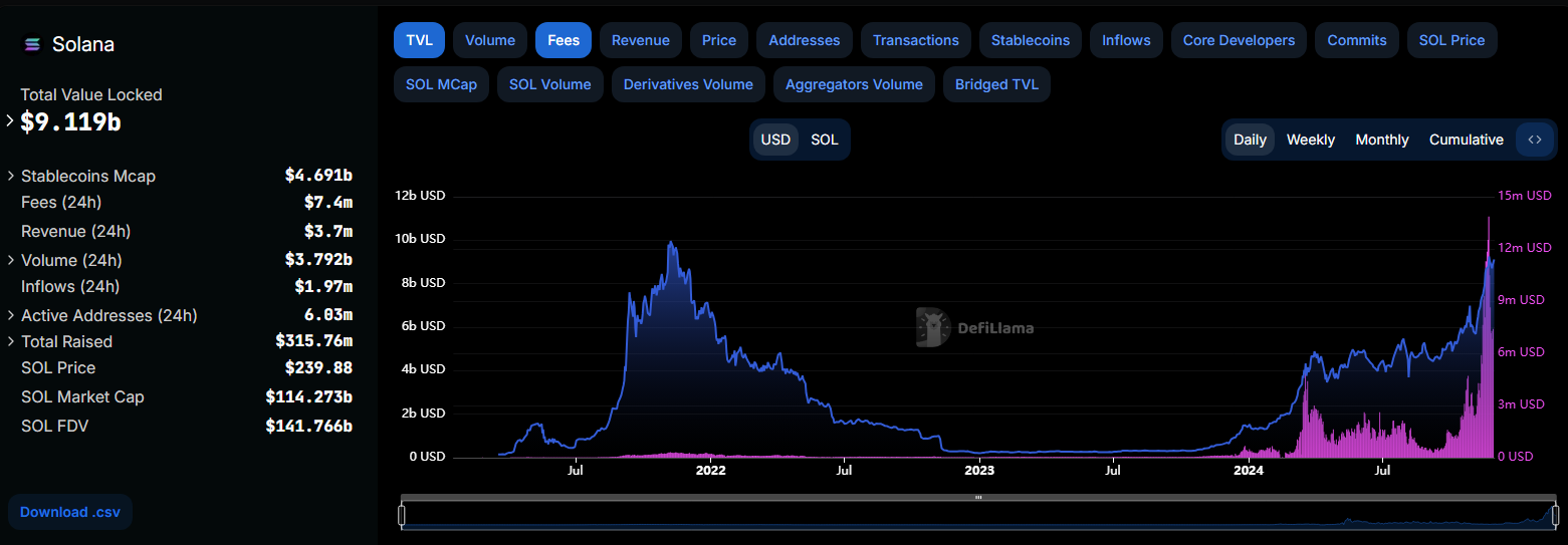 Solana是这波Meme热潮的沃土,多个新晋的龙头Meme大多来自于该链,这为Solana的数据增长、链上活跃等注入了强劲的动力。 DefiLlama数据显示,受Meme币炒作情绪升温,Solana 区块链上的日交易费用在11月22日达到了1,386万美元最高点。