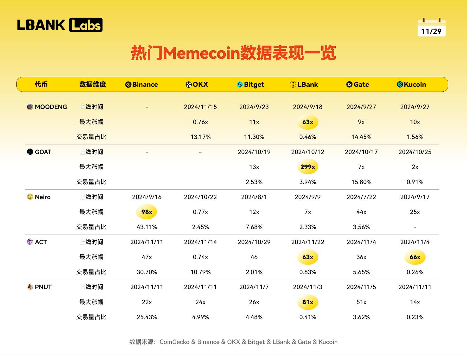 其次,LBank、Gate和Bitget凭借更敏锐的市场嗅觉和更高的上币效率,上币时间最早,成功捕获了Meme市场的早期红利,成为PVP博取Beta收益的最佳战场。其中,LBank早在9月23日首发上线了MOODENG,其最大涨幅达到了惊人的63倍,其GOAT和PNUT分别在LBank上创下了299倍和81倍的涨幅记录。