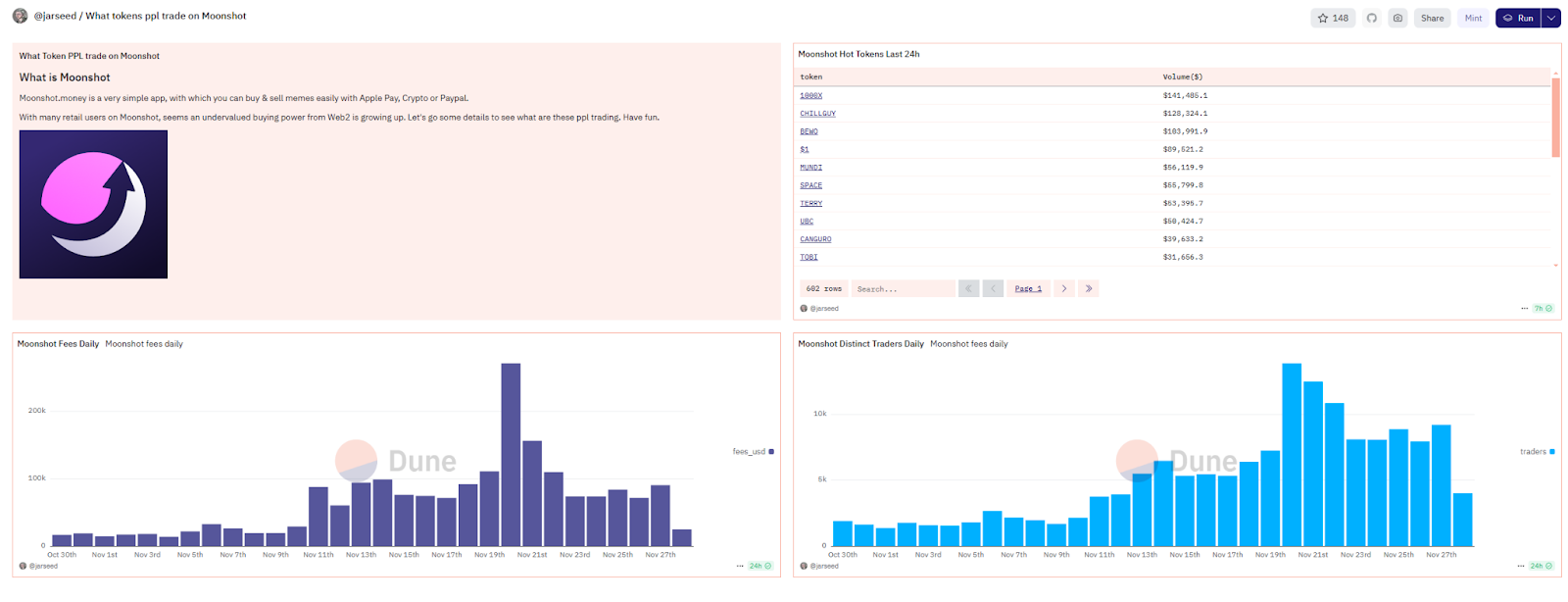 Dune数据显示,Moonshot在交易量、交易费用上整体呈现上涨趋势,九月以来,Moonshot单日手续费收入峰值超过27万美金,单日交易用户最多为13,856人。