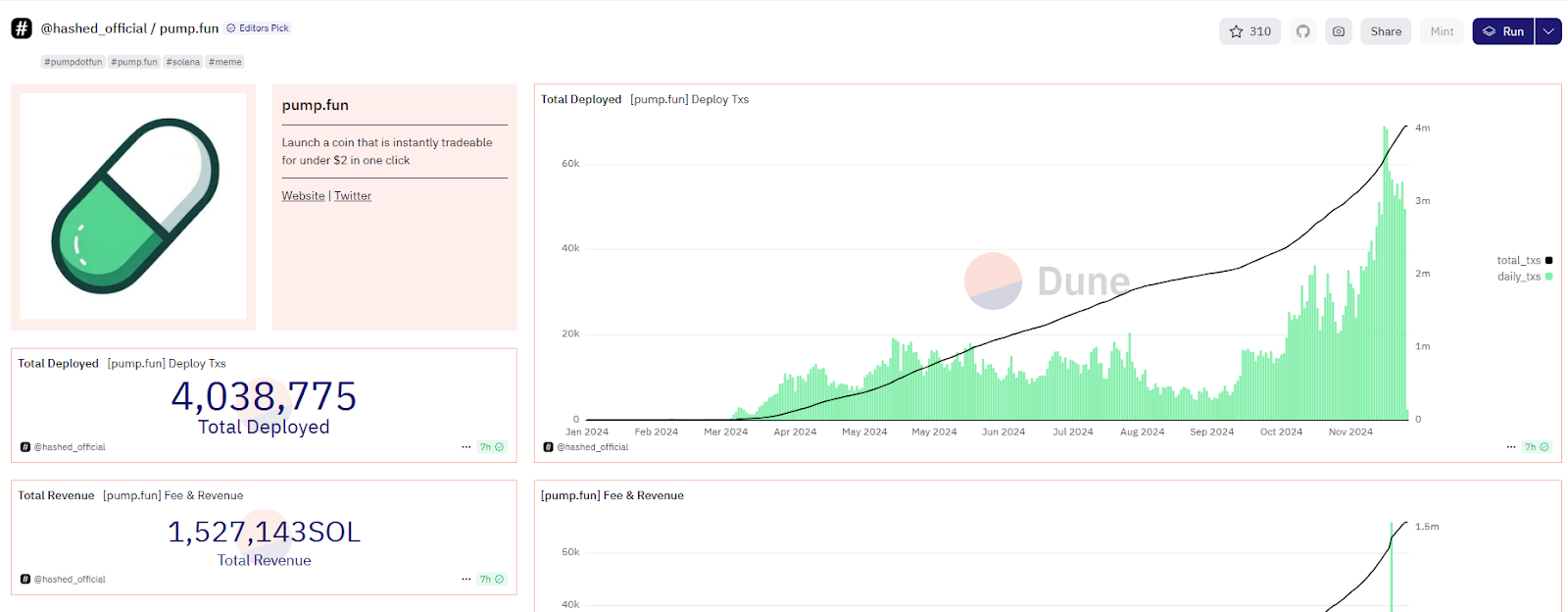Dune数据显示,截至11月29日,Pump.fun自二月份上线以来,已部署超过400万个Meme币,成功捕获了1,527,143个Sol,总收益超过150万美元。