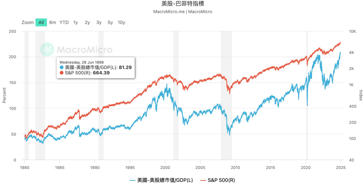 而随着特朗普的回归,其内部削减政府政策会对美国经济结构产生显著的影响。让我们来看一个数据,美股的巴菲特指标。所谓巴菲特指标,股神巴菲特于2001 年 12 月在富比士杂志的一篇专文中提到:股市总市值和 GDP 的比值,可作为判断整体股市是否过高或是过低,因此被泛称为巴菲特指标。此指标可以衡量目前金融市场是否合理反映基本面,巴菲特的理论指数表示 75% 至 90% 为一合理区间,超过 120% 则表示股市高估。