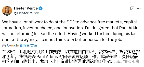 之前呼声很高的SEC加密老妈Hester Peirce也是早早就发推表示支持: