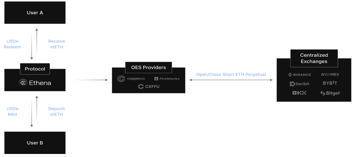 在 Ethena 平台上,用户可以将以太坊或其质押衍生品作为抵押品来铸造 USDe。系统会自动建立 Delta 中性头寸,以稳定 USDe 的价值,抵御抵押资产波动的影响。这一过程包括在衍生品市场开设等值于抵押以太坊价值的空头头寸,从而确保标的资产价格的波动被衍生品头寸的收益或损失所抵消。