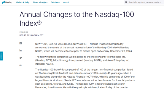12 月 14 日,据纳斯达克官方显示,MicroStrategy(MSTR) 已正式被纳入纳斯达克 100 指数,以超过 980 亿美元的市值成为纳斯达克 100 指数中第 40 大公司。同时添加的企业还有数据分析公司 Palantir Technologies、泰瑟枪制造商 Axon Enterprise,而基因测序设备商 Illumina、AI 服务器制造商 Super Micro Computer 和疫苗制造商 Moderna 则被移除,新指数将于 12 月 23 日市场开盘前生效。