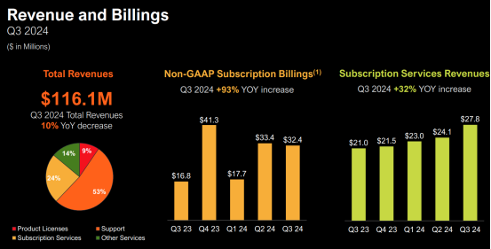 对此,RIA Advisors 的投资组合经理 Michael Lebowitz 就直言,「这本质上是一家没有比特币就会死的企业。」财报也确实如此显示,根据其 Q3 财报,2024 财年前三财季累计收入 3.43 亿美元,去年同期累计收入为 3.72 亿美元,同比减少 7.81%,在 2024 财年前三财季累计净亏损 4.96 亿美元。而从软件业务来看,Q3 软件业务总收入仅为 1.161 亿美元,同比下降 10.3%。