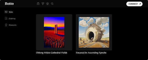 这项创意实验的核心是其艺术引擎,这是一个复杂的系统,结合了文本到图像模型和计算机视觉模型以及各种特殊增强功能。该引擎的输出是根据$BOTTO代币持有者的策展投票进行训练的,这为链上组件提供了关键部分。得票最高的作品随后以 NFT 的形式拍卖,将 Botto 的创作和出处与加密艺术收藏家联系起来。