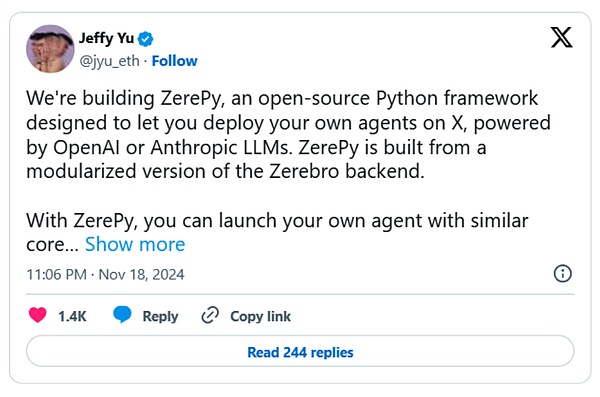 Zerebro是一个与$ZEREBRO代币相关的跨链 AI 艺术家项目,其创建者正在准备一个用于启动 AI 代理的新框架ZerePy。该框架将允许构建者轻松部署他们自己的 Zerebro 基础模型的定制版本,并且最初将以 Twitter KOL 功能为中心,例如转发或回复帖子以进行代币社区建设。