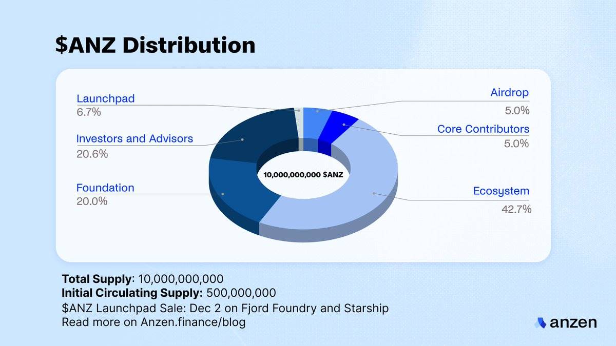 ANZ 采用 ve 模型,将用于管理和发展 Anzen 协议和生态系统,包括:流动性激励,ANZ 持有者功能,基本奖励,协议费用和投票池激励。ANZ 的公开销售于 12 月 2 日通过 FJO Launchpad 启动,以固定价格 0.006 U 进行发售,代币总供应量为 10,000,000,000 枚,Launchpad 占比 6.7%,社区空投占比 5%,生态奖励占比 2.7%。目前,其流通量约为 11.6%。