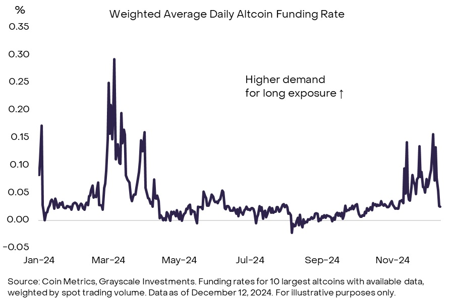 相比之下,山寨币的永续期货未平仓合约 (OI) 已达到相对较高的水平。在 12 月 9 日发生重大清算事件之前,三大永续期货交易所的山寨币未平仓合约已达到近 540 亿美元(图表 9)。这表明整个大盘投机交易者持仓量相对较高。在大规模清算后,山寨币未平仓合约下跌了约 100 亿美元,但仍处于高位。投机交易者多头仓位较高可能与市场周期的后期阶段一致,因此继续监测这一指标可能很重要。