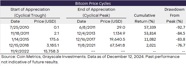 从历史上看,加密货币市场遵循明显的四年周期,价格经历了连续的上升和下降阶段。Grayscale Research 认为,投资者可以监控各种基于区块链的指标和其他指标,以追踪加密货币周期并为自身风险管理决策提供参考。