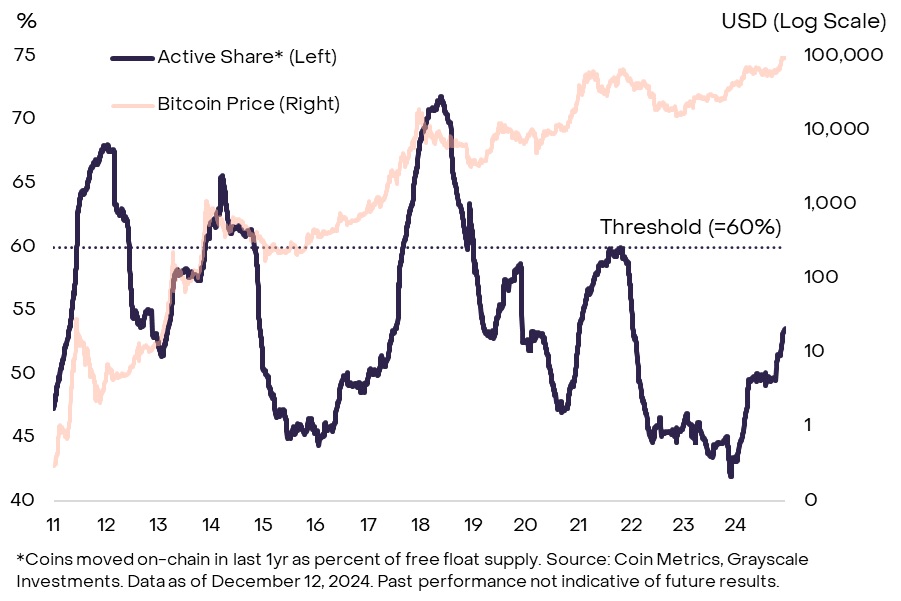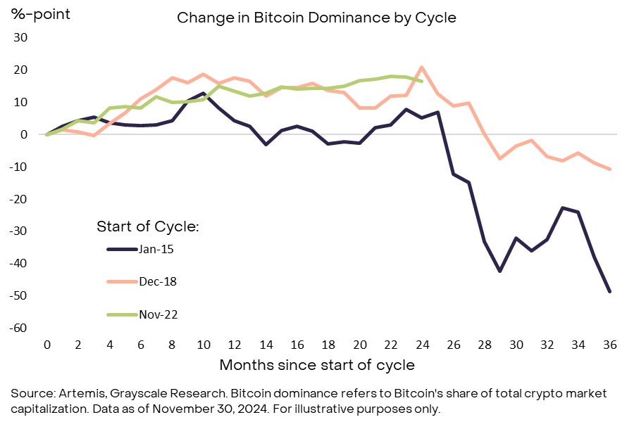 Grayscale Research 认为当前市场正处于新一轮加密周期的中期阶段。只要基本面(如应用采用和宏观市场条件)可靠,牛市就有可能延续到 2025 年甚至更久。