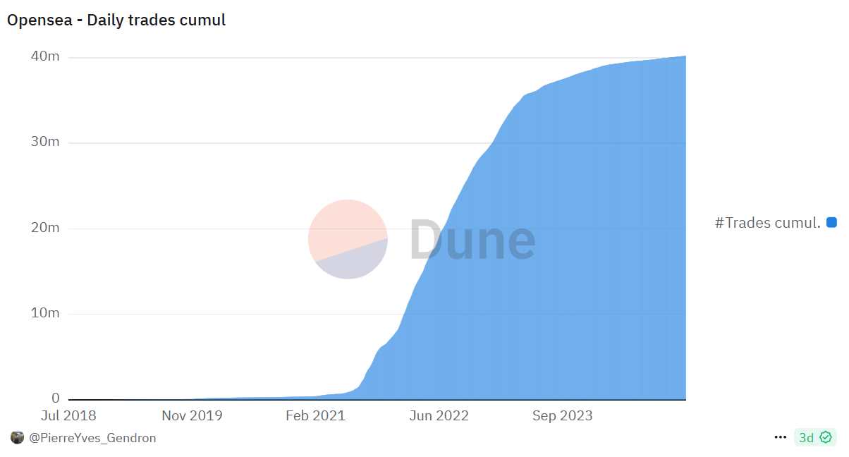 从下图也可以看到 Opensea 整体交易笔数在 2022 年明显放缓,除了本身 Opensea 产品竞争力落后之外,主因仍为 NFT 市场不受青睐。