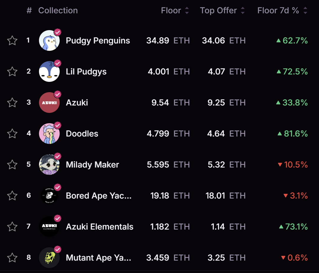 随后出现 BAYC、Azuki、Doodles、Pudgy Penguins 等蓝筹 NFT 项目,开启 2021 年的 NFT Summer