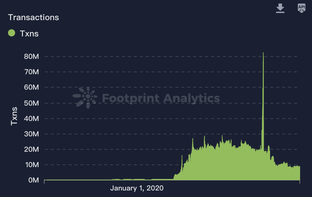 每日交易笔数:今年链游每日交易笔数也较两年前明显下降,此前平均在 2000-3000 万之间,目前已不到 1000 万笔。