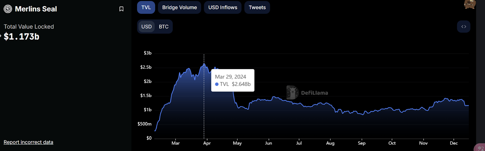 在今年4 ~ 7 月期间,引发比特币质押热潮的协议便是Merlin Chain,协议最高总锁仓量达26 亿4000 万美元,接受资产除了比特币之外,也支援头部铭文、NFT 项目,如ORDI、RATS 等。但在 Merlin 发币后币价不如预期,且在当时有诸多争议,目前整条链 TVL 急遽下滑,市场关注度不再,已经显现 EVM 跨链映射技术被证伪。