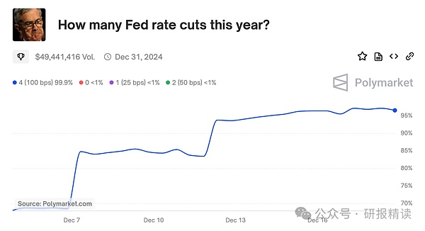 2024年12月18日,美联储主席鲍威尔宣布再降息25基点。对Polymarket的用户来说,这个结果早在两周前就已成定局——在这个用钱投票的预测平台上,降息的概率从12月13日开始就稳定在95%以上。