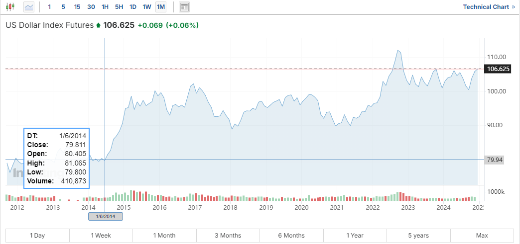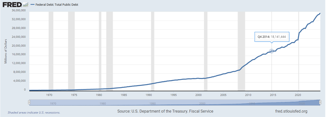 如下图数据,2014年的美元指数在80附近而美债只有20万亿左右,如今美债已增至约36万亿美元环比增长80%,但美元却一反常态的在持续升值。如果美元仍继续走强,结合美国证券交易委员会批准现货比特币ETF,新的增量部分完全有可能覆盖未来发债成本。