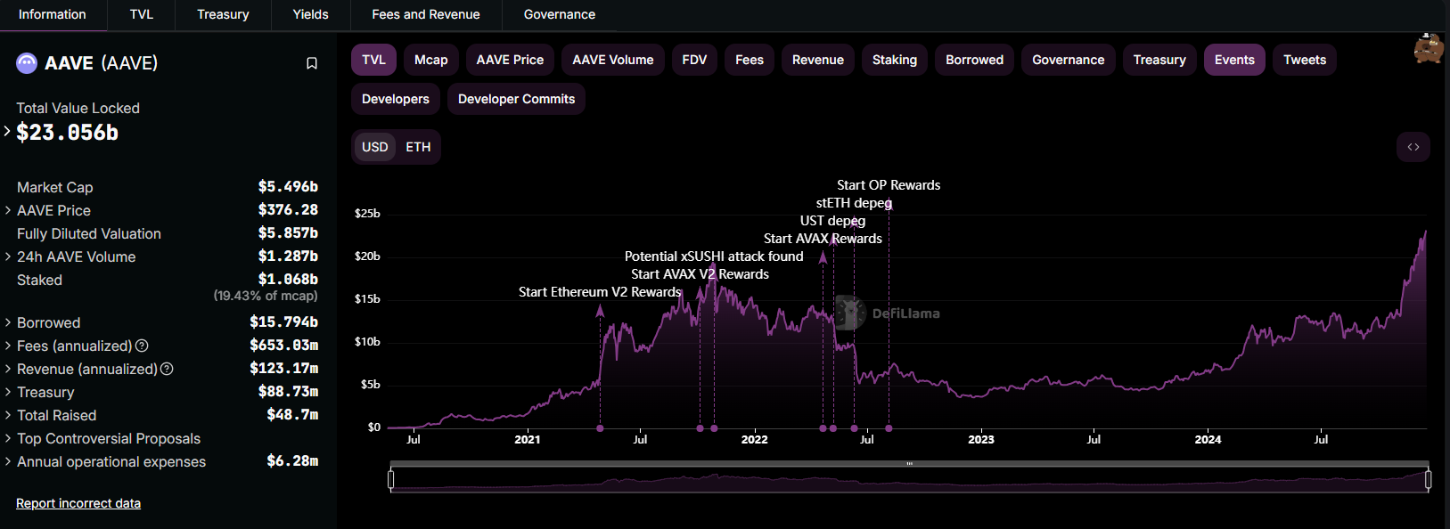 截止2024年12月18日,AAVE的TVL数据也在显著增长,当前已超越21年DeFi Summer顶峰期间的30%水平,达到$23.056B。本轮DeFi协议的变化相比于上轮,更多的是偏向于模块化借贷和更好的资本效益的提升。(模块化借贷协议可参考我们往期所作《模块化叙事的衍生:DeFi借贷的模块化演变》文章内容)