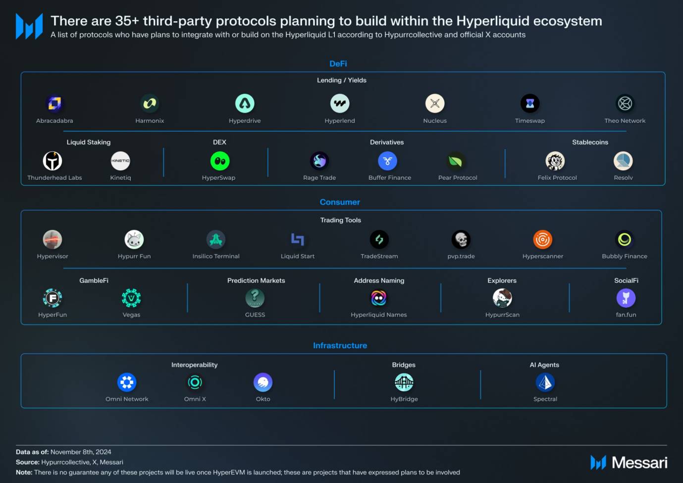 Messari Research@defi_monk 最近对HYPE代币的估值研究,其完全摊薄市值(FDV)在130亿美元左右,在适当的市场条件下可能超过300亿美元。此外Hyperliquid还计划通过TGE(代币生成事件)推出HyperEVM,有超过35个团队计划参与该新生态系统,这使得Hyperliquid更加接近一个通用的L1链,而不仅仅是一个应用链。