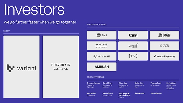 本轮融资还吸引了 Chapter One、Lightspeed Faction、Bankless Ventures、IOSG、Vertex、GSR、Wintermute Ventures、Blockchain Builders Fund、Alumni Ventures 和 Ambush 等知名投资者。