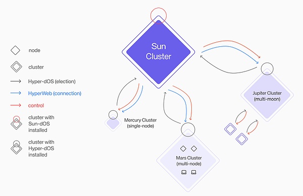 Hyperbolic的去中心化计算优势源于其独特的系统架构——以太阳系为灵感设计的Hyper-dOS。该架构采用分层集群模型,将高效与稳定融为一体。