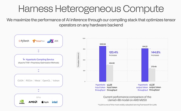 Hyperbolic 的专有编译器确保了 GPU 的高效运行,其性能能够媲美甚至超越集中化系统。