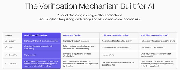 Hyperbolic 通过抽样证明协议(PoSP)解决了 AI 验证中的安全性问题,同时实现了最小的计算开销,与 zkML、opML 和基于共识的替代方案相比更具优势。此外,Hyperbolic 完全不存储用户数据,进一步保护隐私。